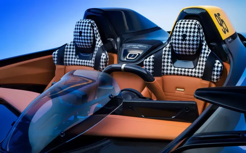 كما تأتي المقاعد مستوحاة من مقاعد سيارات السباق الكلاسيكية، مصممة لتلائم الراكب، مغطاه بجلود فاخرة متناغمة مع لمسات من الجلود تزين لوحة العدادات. ونجد أن تصميم المقاعد مقسم إلى جزئين مستوحى من مقاعد Pura Vision، مع إدراجات ألومنيوم فريدة. أما وسائد الرأس فهي مصنوعة من نسيج Pied de Poule Houndstooth Luxury Textile مع غرز تباينية سوداء وأنيقة.
