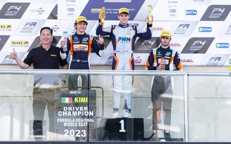 توج الإيطالي أندريا كيمي أنتونيللي بطلاً لبطولة الشرق الأوسط الإقليمية للفورمولا (FRMEC) لعام 2023 برعاية جيتي للإطارات بعد الجولة الأخيرة في حلبة مرسى ياس في أبو ظبي. تصارع أنتونيللي ومنافسه الرئيسي ، تايلور بارنارد ، على الصدارة في السباق الأول وشاهد المتفرجون أنتونيللي يأخذ العلم المضلع. ومع ذلك ، وبسبب عقوبة في حادث تصادم مع منافسه الرئيسي تايلور بارنارد حيث صارعوا من أجل الصدارة في السباق، لم يظفر السائق الإيطالي البالغ من العمر 16 عامًا بأي فوز في سباق يوم الأحد 19 فبراير 2023. على الرغم من هذه الانتكاسة ، لا يزال أنتونيللي يحافظ على صدارة نقاطه ليبرز كبطل شامل للسلسلة.