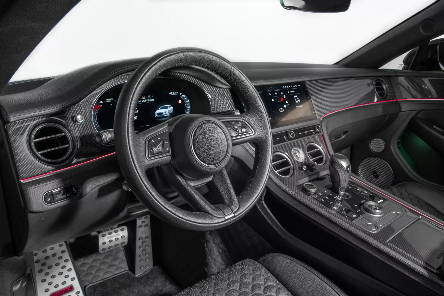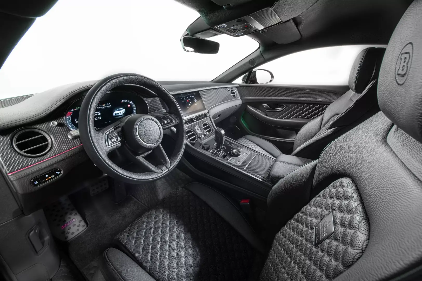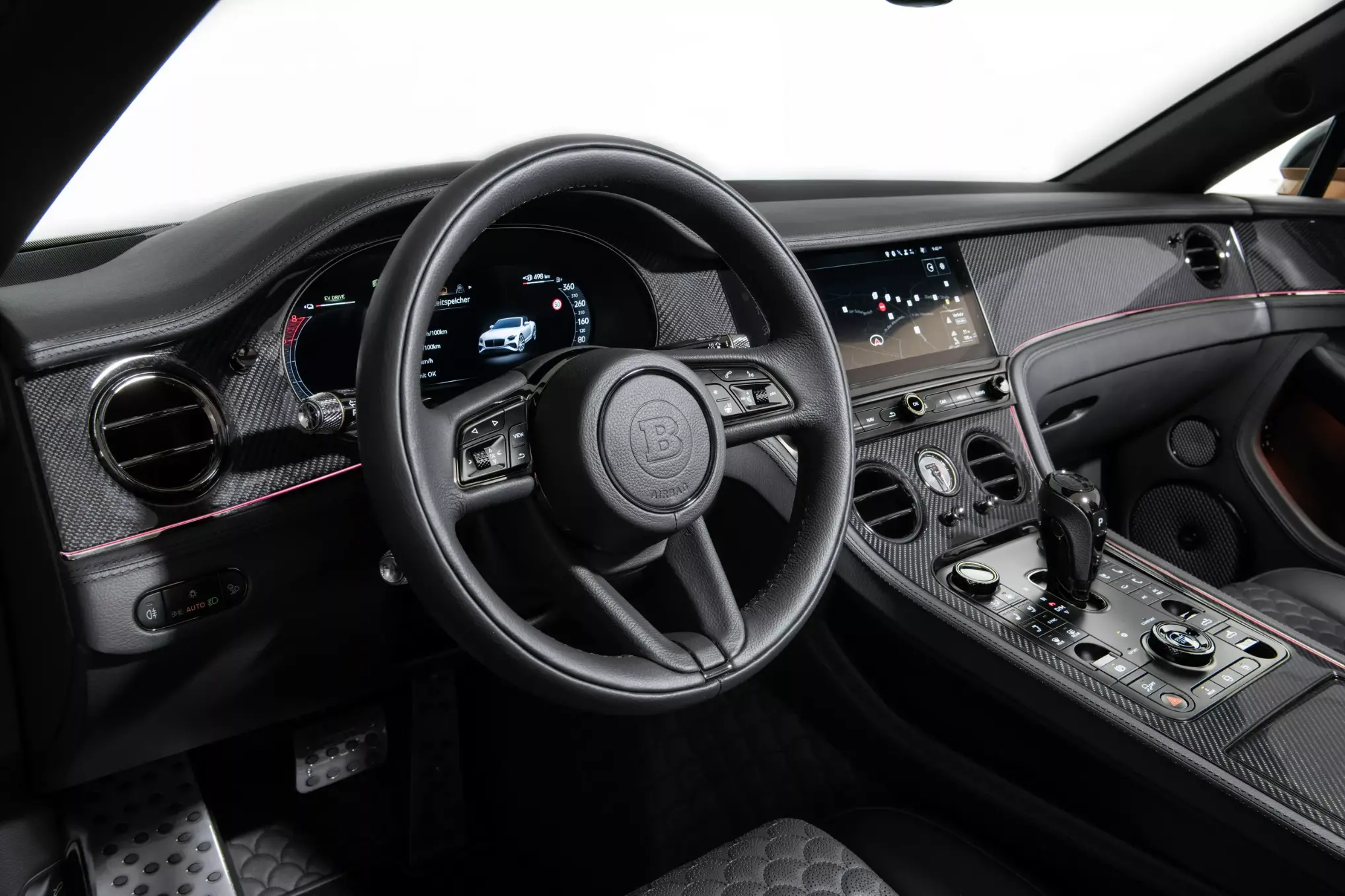والأكثر جرأة أن برابوس أزالت جميع شعارات بنتلي الأصلية، بما فيها حرف B المجنّح الشهير، واستبدلته بإضافات كربونية على غطاء المحرك والباب الخلفي، رسالة واضحة بأن هذه السيارة لم تعد تنتمي للماضي.