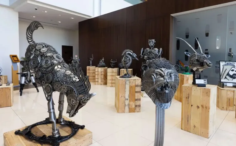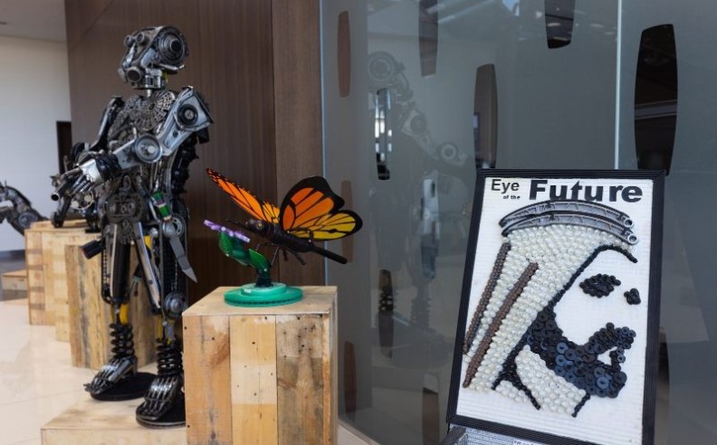 يضم المعرض مجموعة مذهلة من الأعمال الفنية التي صنعها الفنيون الموهوبون العاملون لدى شركتي الطاير للسيارات وبريمير موتورز من قطع الغيار المستعملة وخردة السيارات، وذلك ضمن إطار مسابقة داخلية نظمتها الشركة للفنيين العاملين لديها.