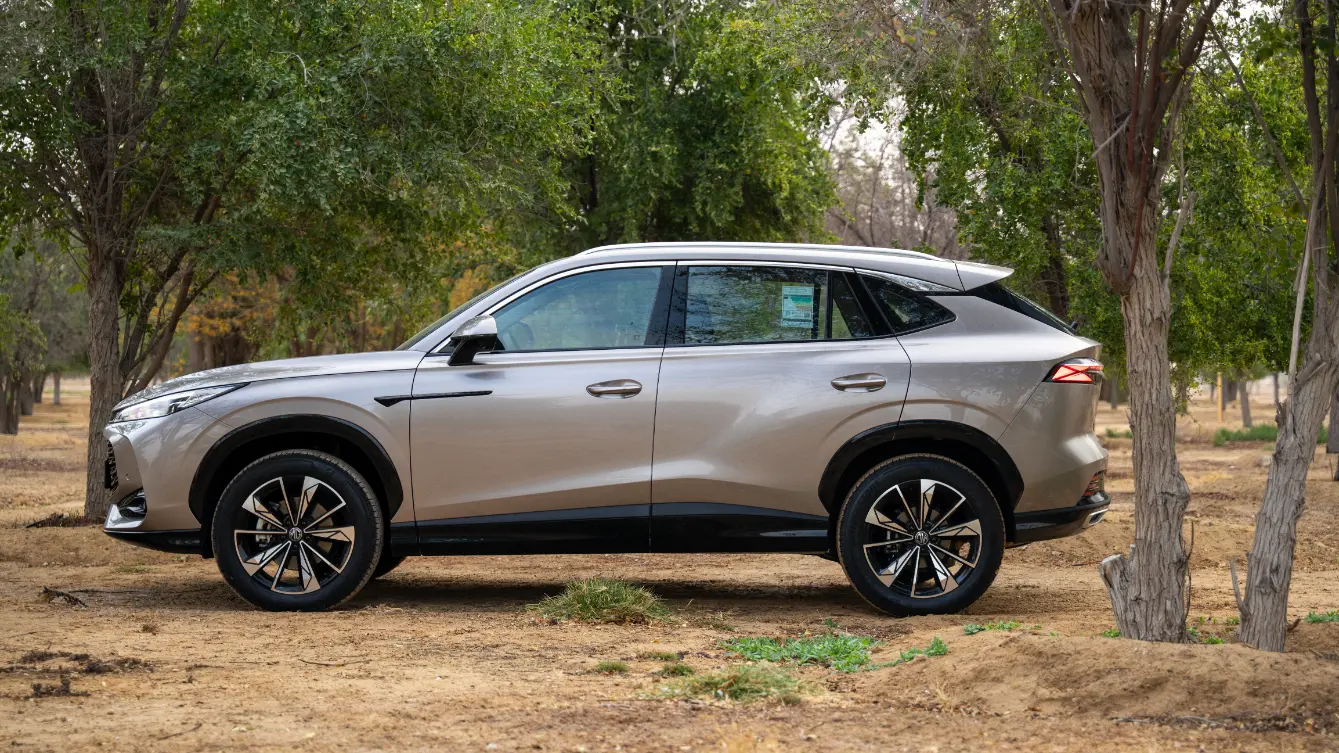 From the side, the 19-inch alloy wheels stand out with a unique black and chrome pattern, enhancing the sporty character of the car. The dynamic lines on the bodywork give the crossover an aerodynamic look, while the black accents continue along the wheel arches, adding a rugged yet elegant feel.