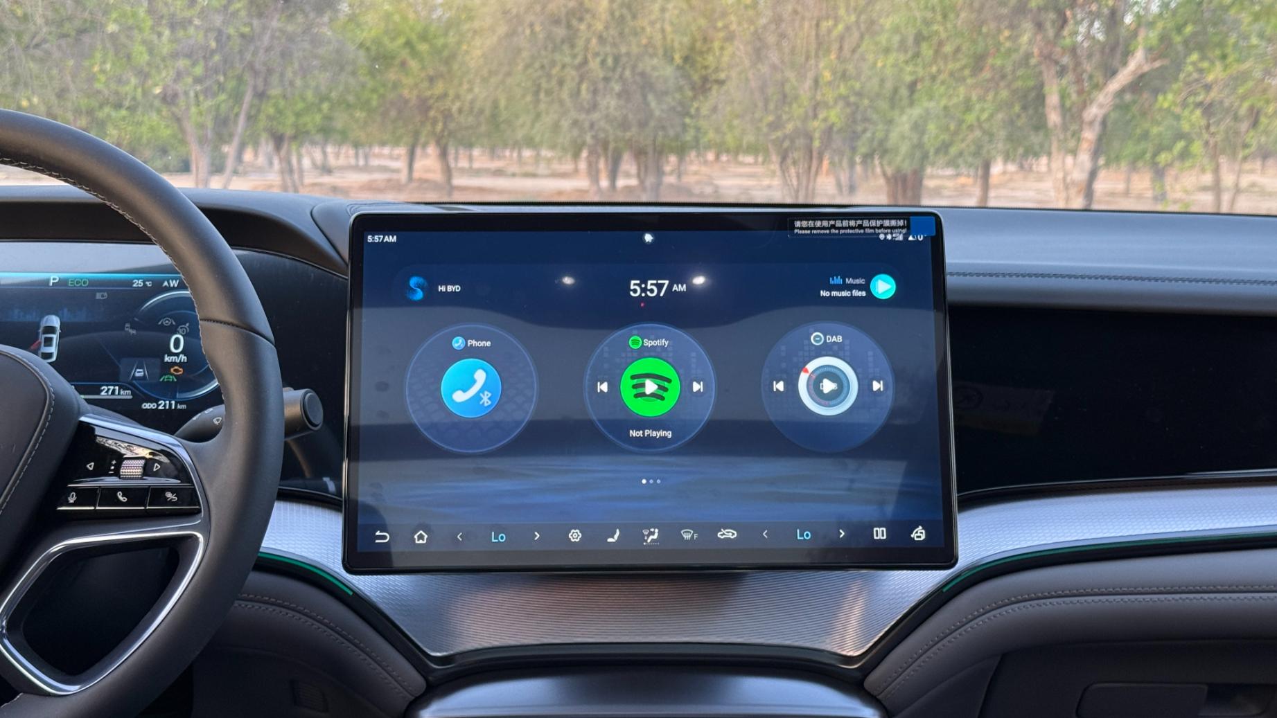 Above, the panoramic sunroof floods the interior with natural light. The rotating 15.6-inch multimedia touchscreen offers access to BYD’s DiLink OS, compatible with Apple CarPlay and Android Auto, while the 12-speaker Dynaudio sound system delivers crisp, immersive audio that elevates every journey.