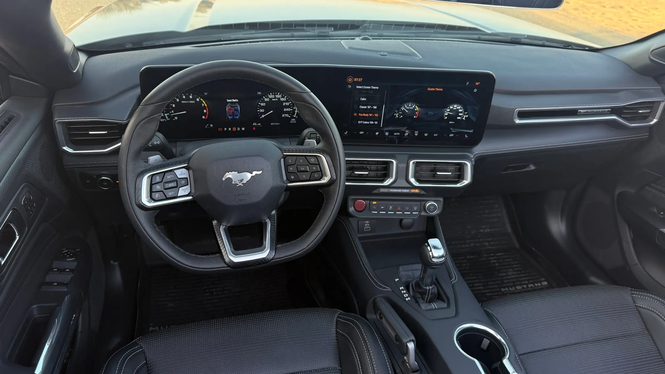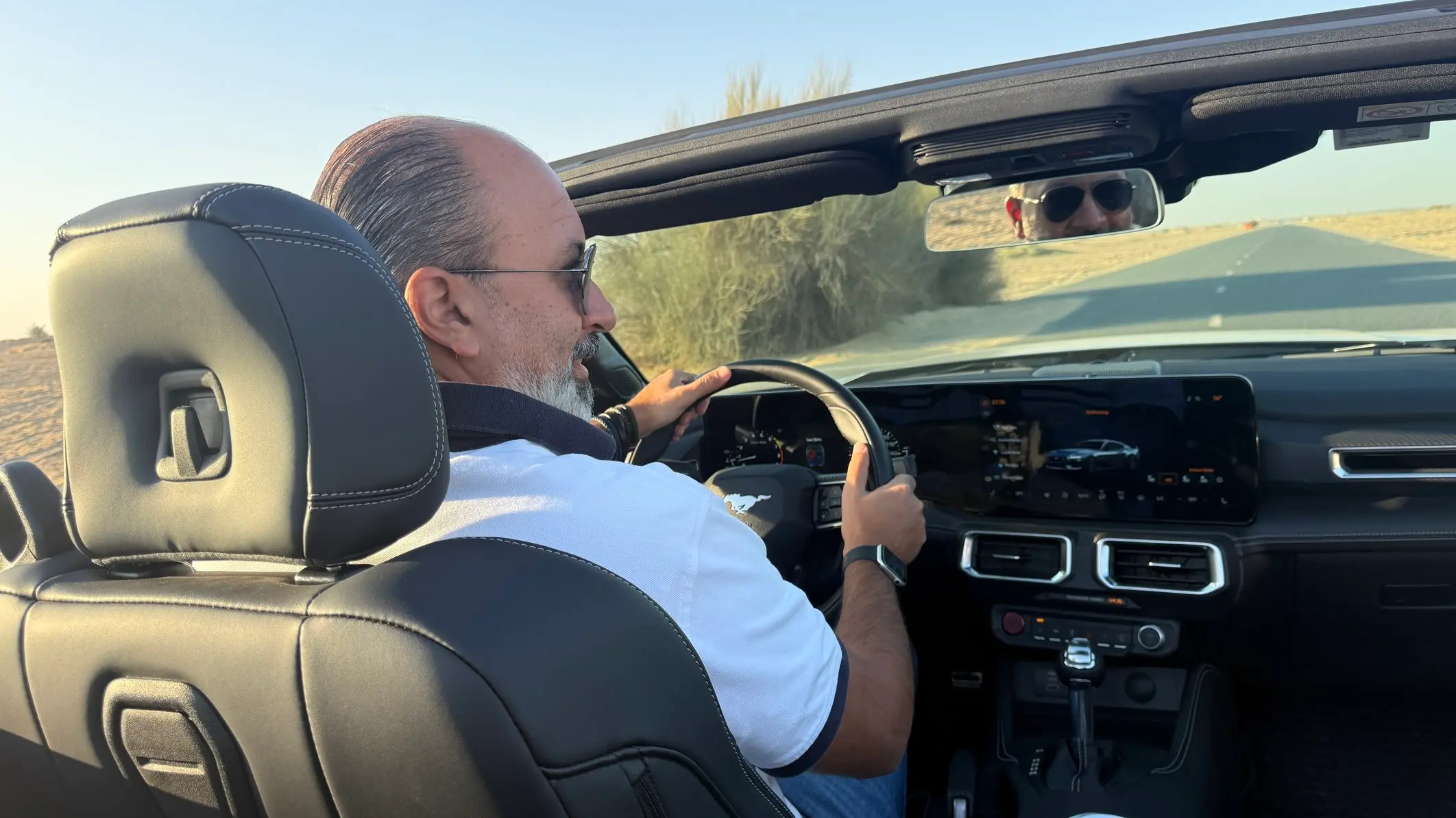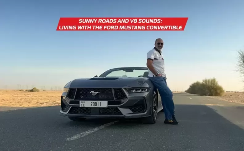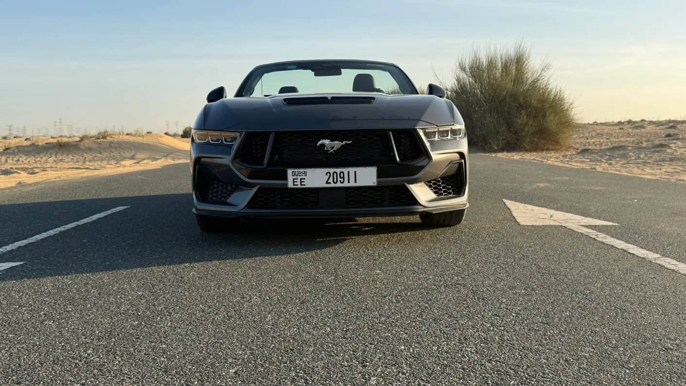 With the roof down, the Mustang feels perfectly suited to middle east weather during cooler months. Wind deflectors and smart airflow design help keep the cabin comfortable even at highway speeds. The rear design remains muscular, with tri bar taillights and dual exhaust outlets reinforcing the car’s muscle car identity.
