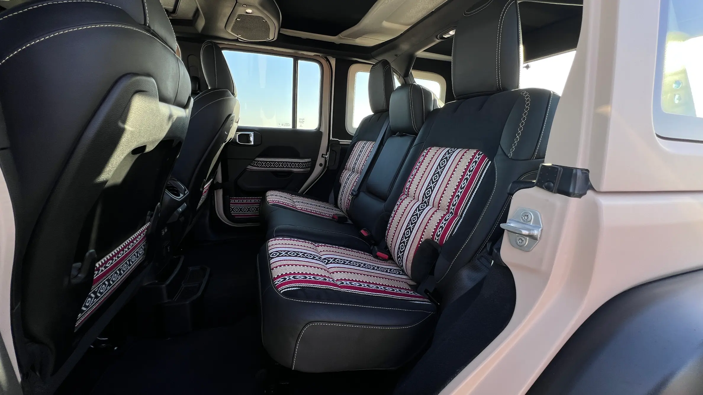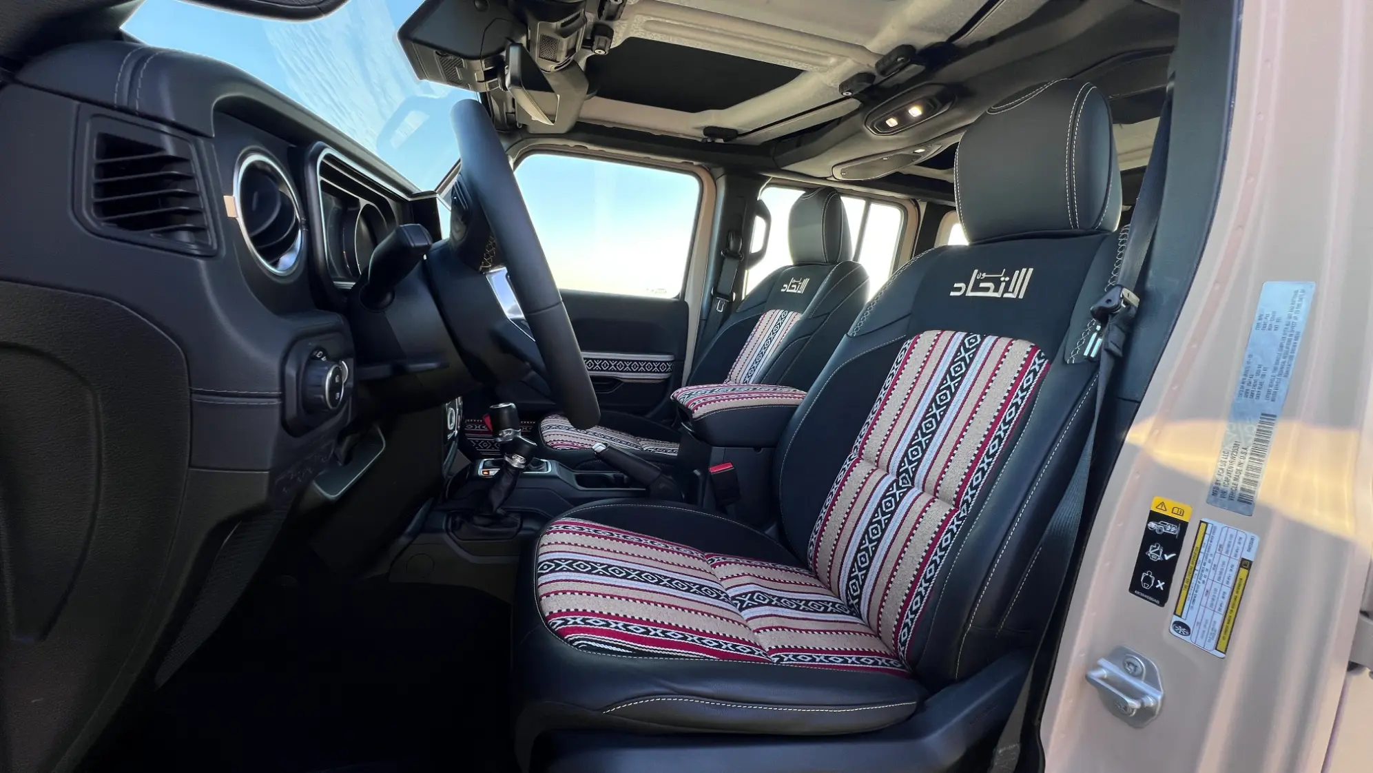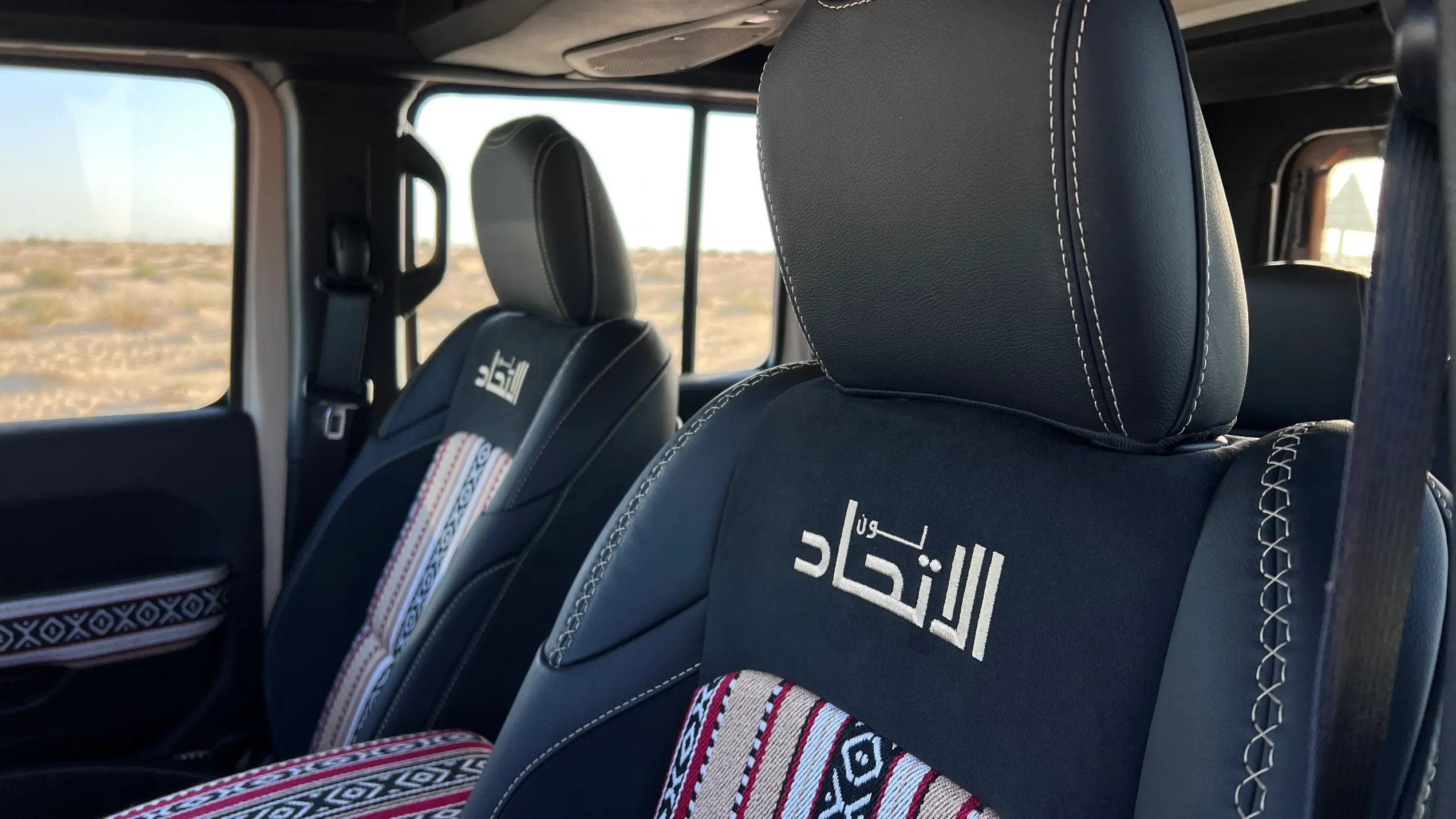 Step into the cabin of the Jeep Itihad Special Edition, and you are greeted by an interior that harmoniously blends modern comfort with rich Emirati tradition. The design pays homage to local heritage by incorporating authentic elements that celebrate the region’s cultural legacy. Premium Sudou fabric, a traditional textile renowned for its texture and significance, upholsters the seats, imbuing the space with warmth and elegance.