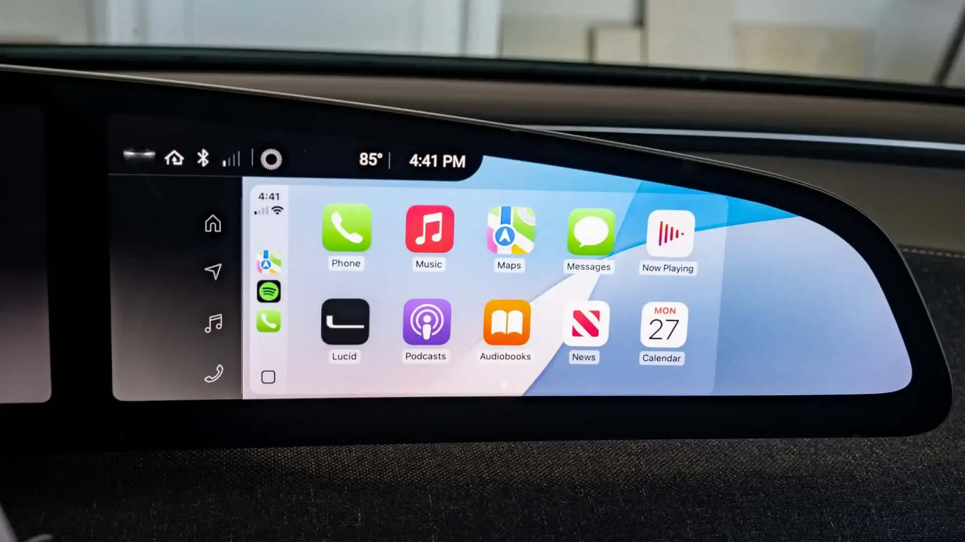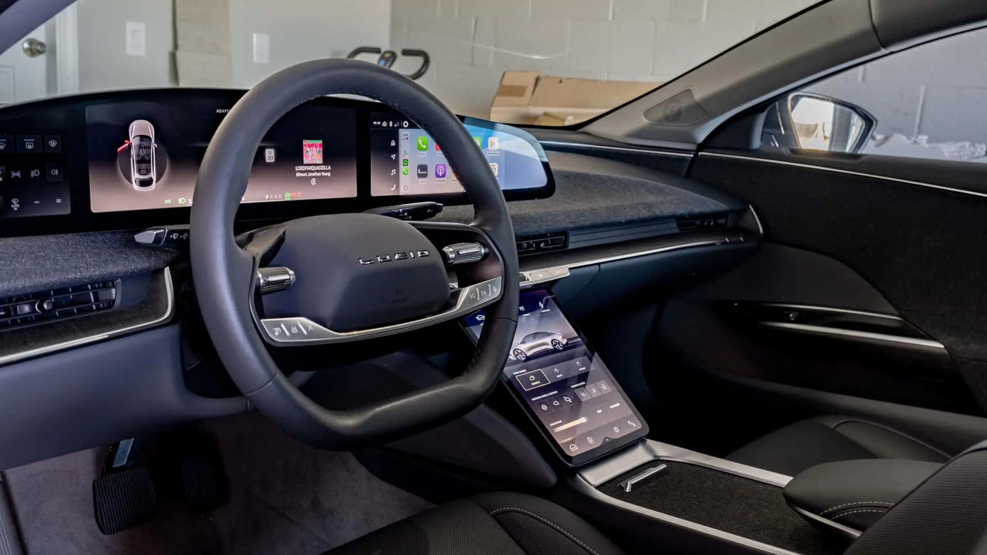 Lucid’s infotainment setup is both practical and visually appealing. The center touchscreen is smaller than those found in some competitors but remains highly functional. The home screen layout is clean, placing crucial information—such as navigation, weather updates, and audio settings—front and center. Wireless Apple CarPlay comes standard, though the curved display reduces its effective area, leading to an awkward fit. Android Auto, while currently unavailable, is expected to arrive in a future update.
