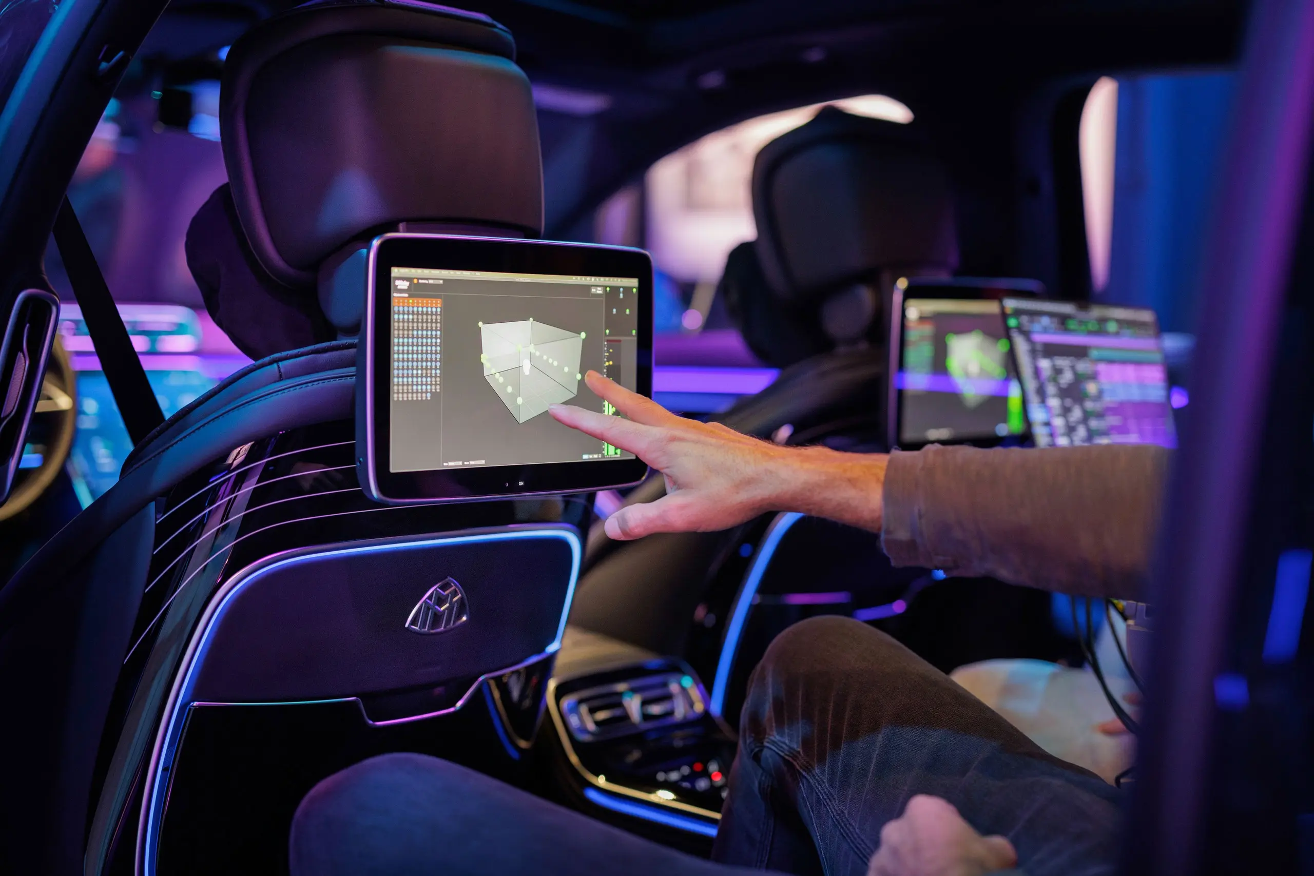 Mercedes has equipped the Maybach S 680 with a Burmester speaker system enhanced by Dolby Atmos and custom software. This combination allows sound to move in all directions, not just side to side, but also above and below, mimicking the 360-degree audio space of a real studio. To showcase this, music producer Aron Forbes played a live mix from his laptop through the Maybach’s system. The rear seat became the new studio booth.