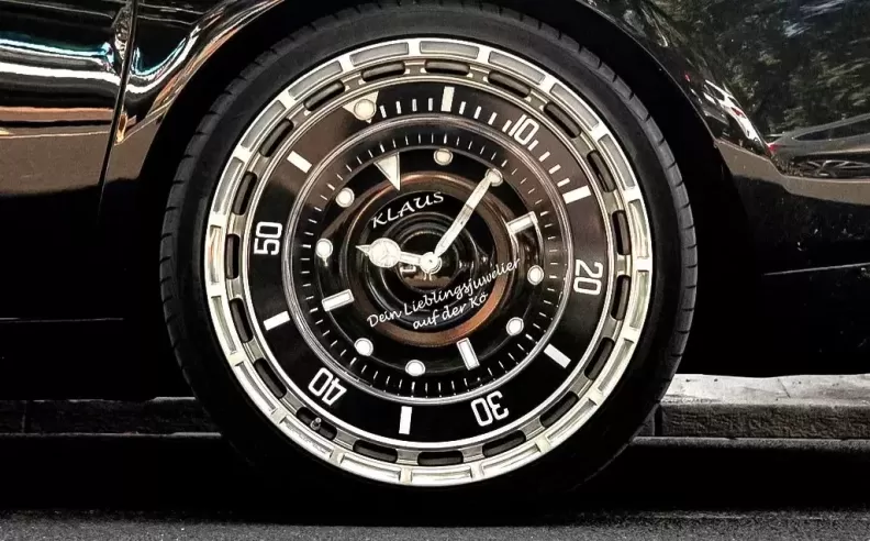 For Klaus Konigsallee, who counts diamonds and rare watches among his daily essentials, regular luxury was not enough. The answer was bold: commission German tuner Novitec to build custom wheels modeled after the Rolex Submariner’s legendary bezel. Each twenty four inch rim features chunky time markings, deep edged accents, and fine lines mimicking the signature style of a Submariner. Details are everywhere, including the owner’s name Klaus in the wheel center and an engraved phrase that nods to his favorite jeweler on the exclusive Konigsallee shopping boulevard in Dusseldorf. This is not just a set of wheels, it is a rolling tribute to timeless style.