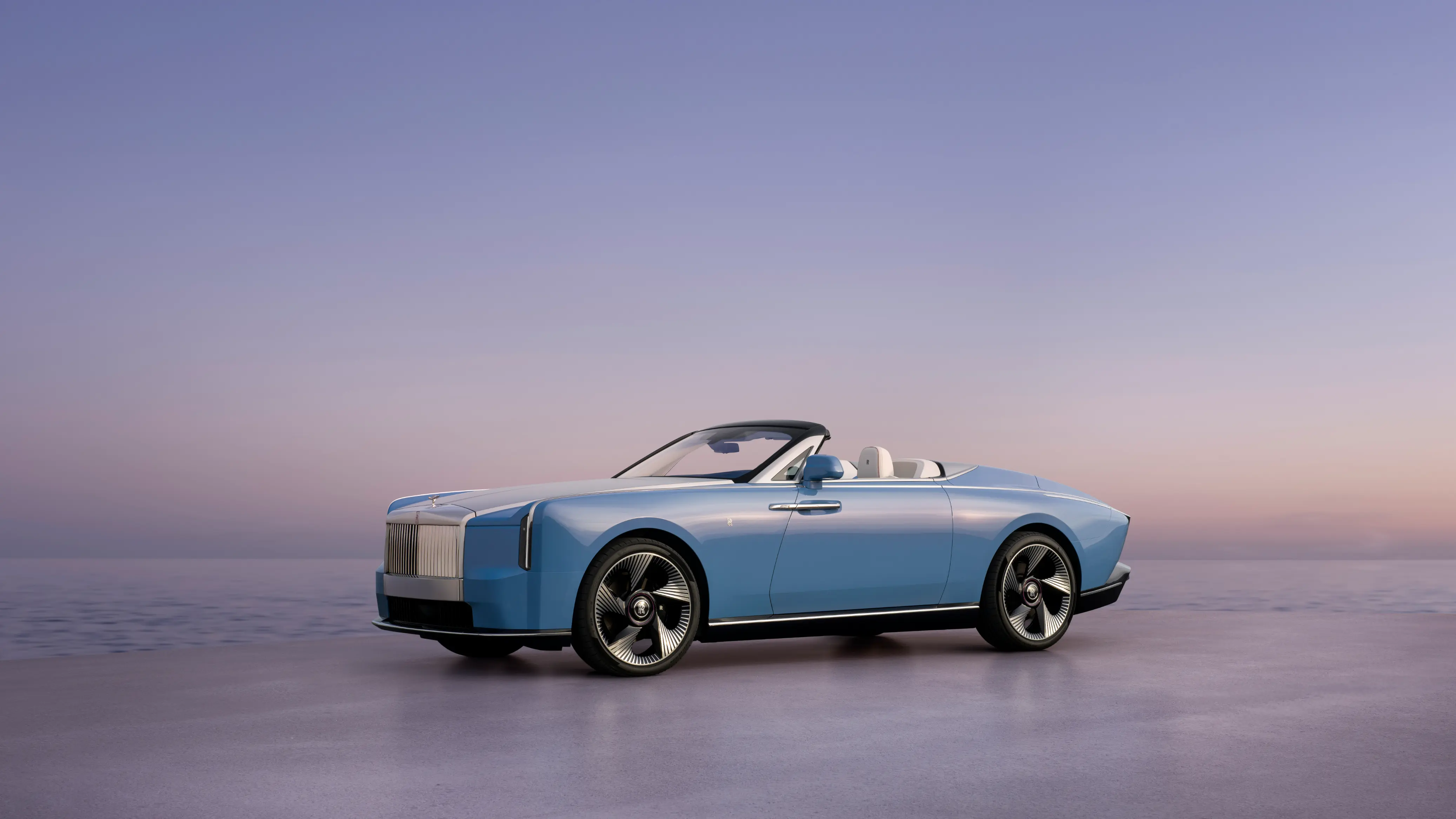 Rolls Royce shapes Project Nightingale with Streamline Moderne influence, focusing on clean surfaces, precise lines, and uninterrupted volume rather than heavy ornamentation. At 5.76 metres long, it is almost as long as a Phantom, yet it is dedicated entirely to two seat open air motoring. The front features a wide Pantheon Grille with 24 deeply set vanes, a recessed Spirit of Ecstasy, and slender vertical headlamps. In profile, the car has a torpedo like shape with a long bonnet, sharply raked windscreen, compact cabin, and flowing rear deck. The largest wheels ever fitted to a Rolls Royce measure 24 inches and add a sense of motion even when the car is standing still.
