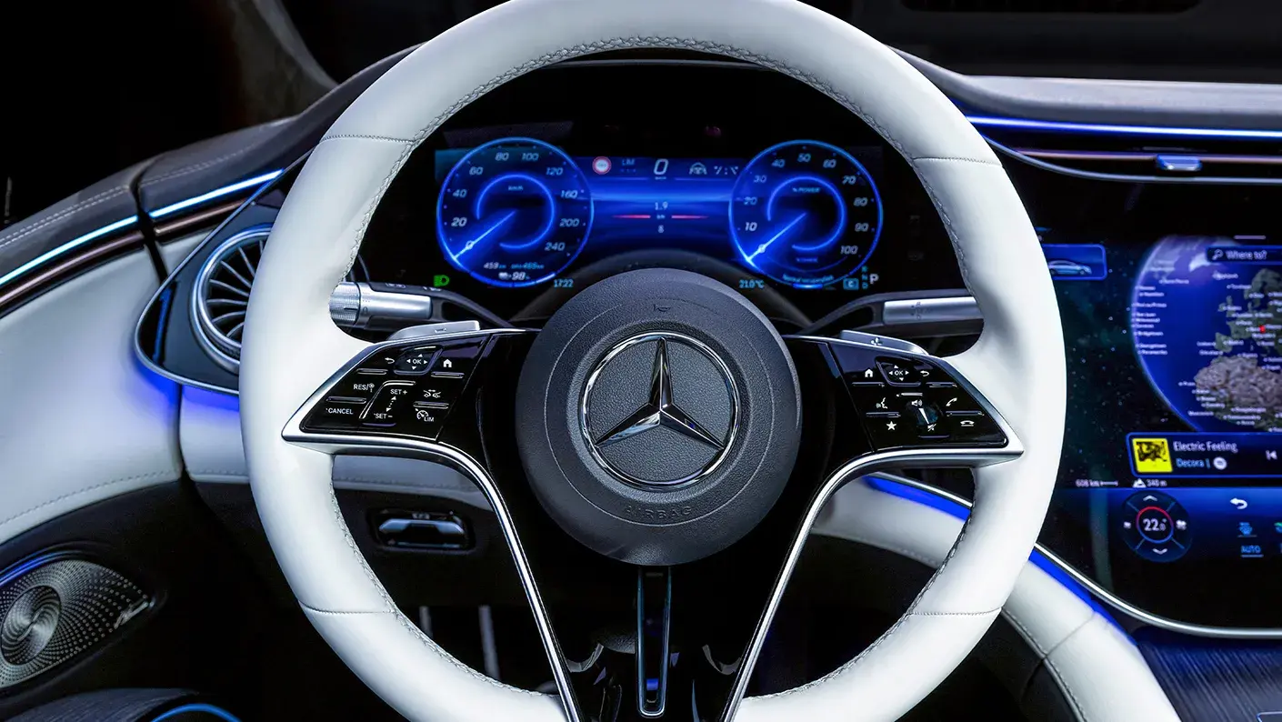 The EQS comes loaded with tech from the start, led by the Mercedes Hyperscreen that covers the dashboard with three seamless displays. The system runs the latest MBUX software, supports natural voice commands, and lets both front passengers interact with navigation, audio, and car settings at once.