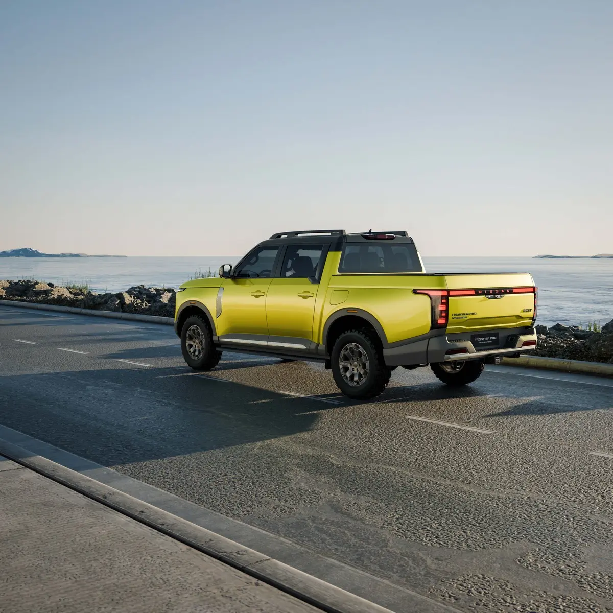 Within the front mask, the Nissan brand logo is illuminated in vibrant white, proudly signifying the Frontier Pro’s new era of electrified capability. Parallel to the hood line, five LED light elements, spaced apart, accentuate the width of the truck. The three central lights pay subtle homage to one of Nissan’s most iconic pickup trucks.