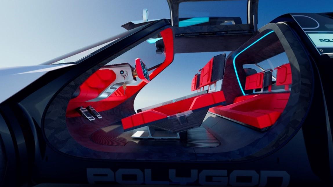 Polygon’s cockpit is just as futuristic. Four circular pods on the Hypersquare give you fingertip access to key functions, letting you keep both hands on the wheel at all times. The traditional dashboard is gone, replaced by a massive micro LED display that projects everything you need directly onto the windshield. Drivers can even personalize the projected info, with different modes (Cruise, Fun, Hyper) changing the entire feel of the cockpit. Stationary, the interior lights and animations can be customized, creating a truly immersive environment inside and out.