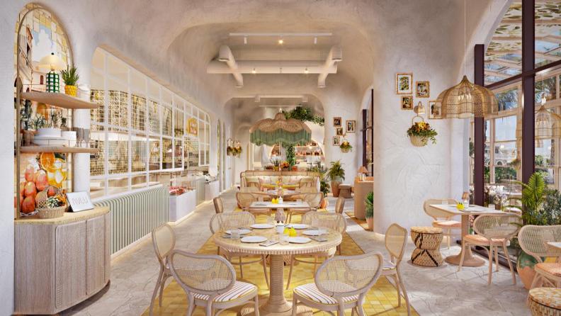 يستوحي التصميم إلهامه من شواطئ البحر الأبيض المتوسط المشمسة، حيث تتناغم درجات الأبيض الكريمي مع ألوان الحمضيات، والأصفر الباهت، والفسيفساء، والجداريات، واللمسات الطبيعية، لتنشأ بيئة راقية وهادئة في آن واحد، تشبه أكثر حديقة ساحلية مشمسة من كونها غرفة طعام تقليدية. ويُضيف المطبخ المفتوح، والشرفة المطلة على الواجهة البحرية، والجداريات والمنحوتات المصممة لالتقاط الصور لمسة من الجاذبية والحميمية، مما يعزز تجربة الضيوف ويحوّل المطعم إلى وجهة تجمع بين الطعام والفن وأسلوب الحياة الراقية.