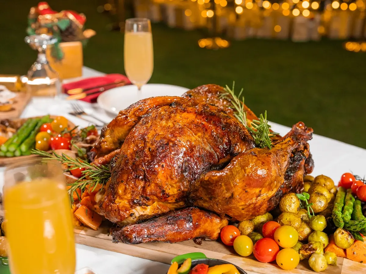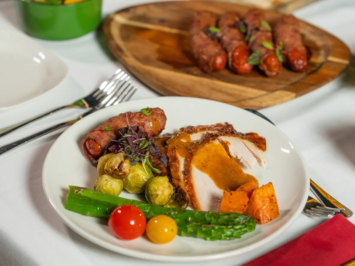 يُقدّم المنتجع تجربة طعام احتفالية جاهزة عبر ديك رومي مشوي بعناية، محشو بحشوة تقليدية أو مُعدّ بطريقة بسيطة، مع بطاطا مشوية وخضروات موسمية ونقانق تشيبولاتا وصلصات خاصة. تتوفر الخيارات بوزن 4 كغ مقابل 650 درهماً أو 8 كغ مقابل 850 درهماً، مع إضافات بسعر 55 درهماً وحلويات موسمية بـ 195 درهماً.