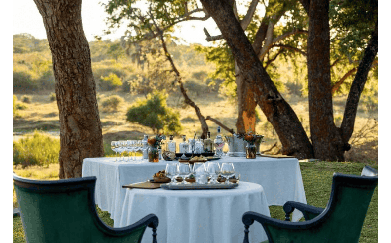 As the sun sets, guests are invited to indulge in a curated gin tasting experience on the hotel’s garden terrace or in the garden overlooking a watering hole. The experience showcases a selection of regional craft gins paired with botanicals and gourmet bites, the perfect way to toast to another day in the African bush. Dining at 1871 Restaurant showcases seasonal Zimbabwean flavors with elegant execution. Menus feature regionally inspired dishes like Zambezi crayfish and smoked venison carpaccio, complemented by garden-fresh ingredients and local beverages. Guests may dine beneath chandeliers or out on the terrace as wildlife gather at the nearby watering hole.