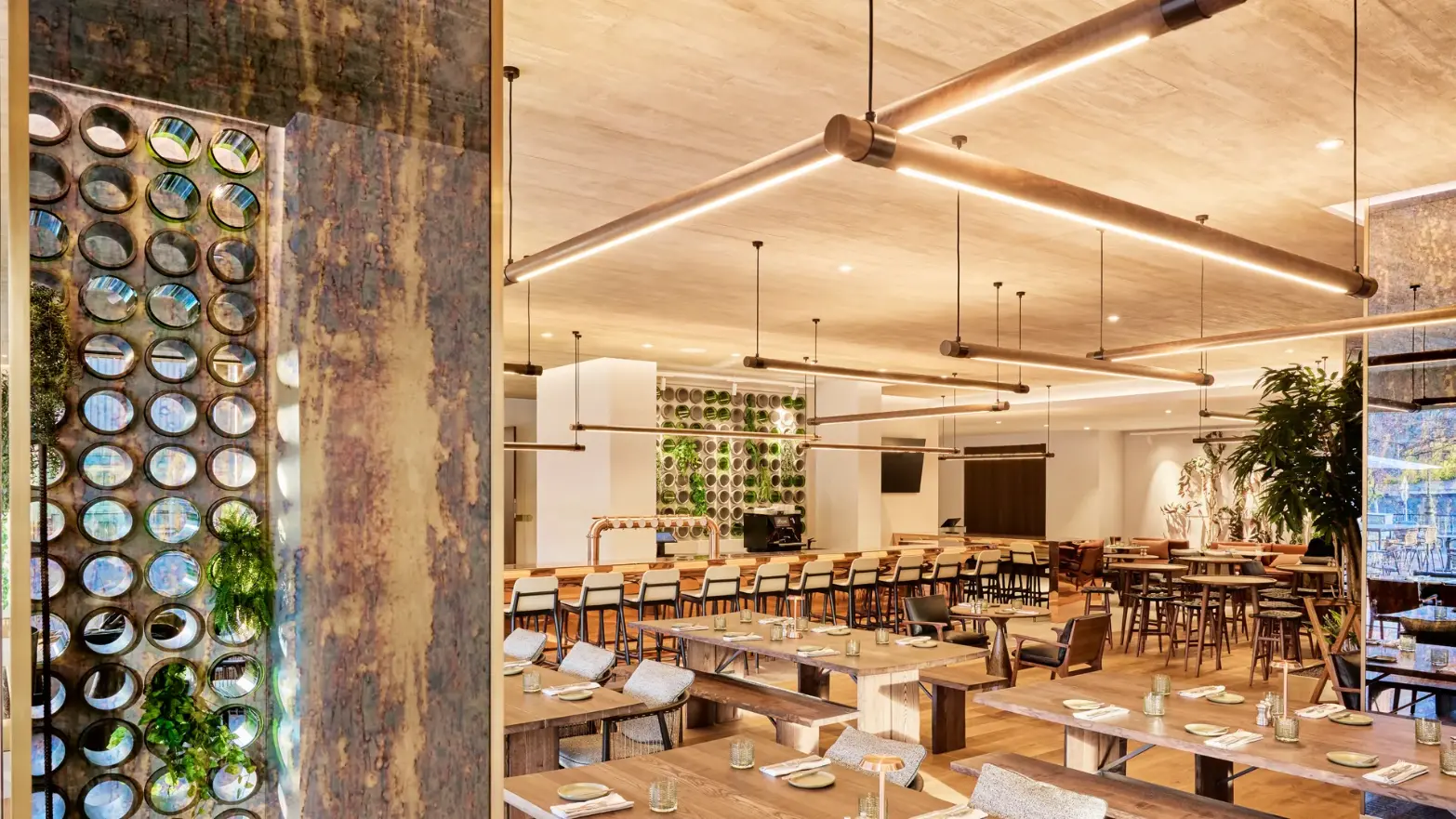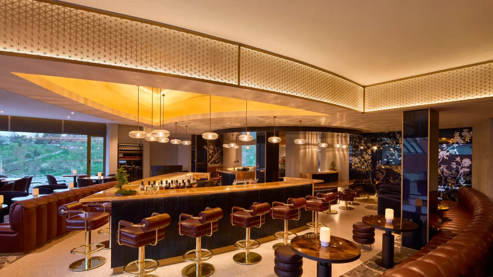 The hotel embraces the bold modernist architecture of the 1970s and transforms it into a luxurious visual statement. Wide glass façades, sculptural windows, and colored glass panels create a bright, gallery-like atmosphere throughout the property. Instead of masking its original structure, the redesign celebrates it turning mid-century elements into a refined contemporary aesthetic that attracts guests seeking a hotel with character and story.