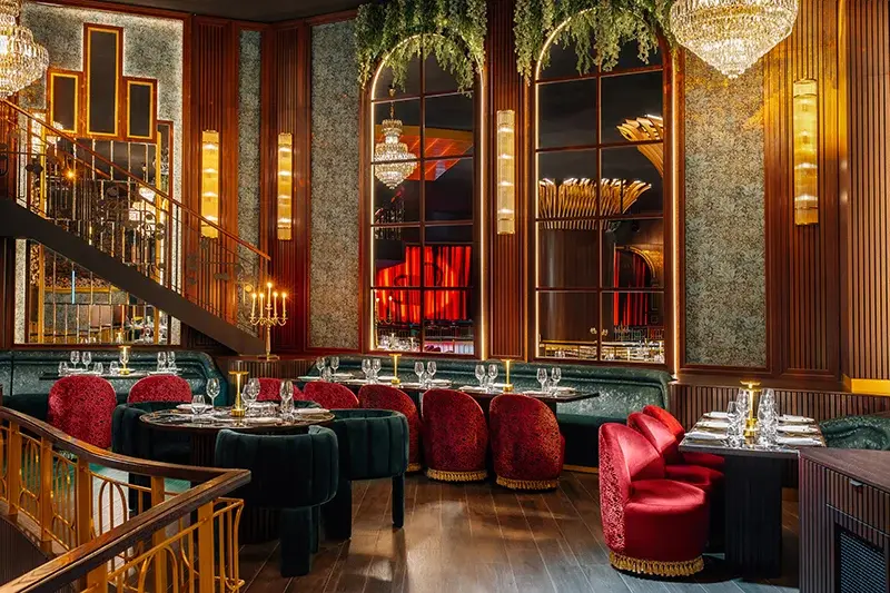 As soon as guests step into Gatsby in Dubai, the atmosphere shifts completely. The surroundings feel like a scene taken straight from a classic film set in the 1920s. Before the main show even begins, visitors are welcomed into an elegant lounge filled with plush seating and rich décor. Live performers move through the space wearing extravagant period costumes, interacting with guests and setting the tone for the night ahead. This early immersion makes guests feel like part of the era before taking their seats for the main performance.