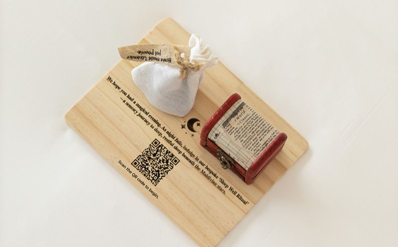 Within the villa, refined linen presentation and soft ambient lighting create a tranquil visual atmosphere as evening settles over the island. Elsewhere, in-house crafted potpourri fills the room with gentle, natural fragrance, while a dedicated sleep music channel offers soothing soundscapes designed to quiet the mind before bedtime.