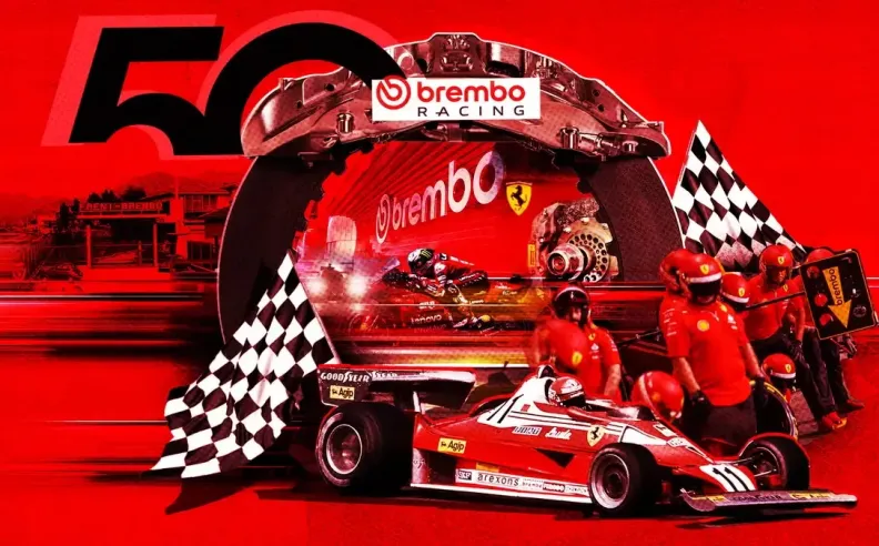 في عام 1975، حققت بريمبو قفزة تاريخية عندما اختارتها فيراري كمزود رسمي للمكابح لفريقها في الفورمولا 1. وكانت النتيجة مذهلة: السائق نيكي لاودا حقق خمس انتصارات، وتُوج ببطولة السائقين، كما فازت فيراري ببطولة الصانعين. وسيارته 312T التي كانت مزوّدة بمكابح بريمبو، كانت تأكيد عملي على تفوق أداء الشركة.