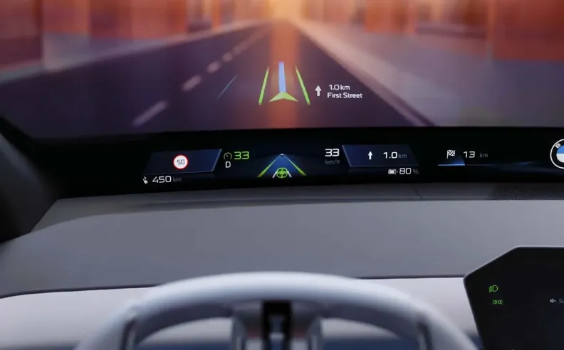 نظام "رؤية بانورامية" (Panoramic Vision) هو الحل الجديد من بي إم دبليو الذي يلغي الحاجة إلى شاشات كبيرة متزايدة الحجم أو لوحات العدادات التقليدية. فيعتمد النظام على عرض المعلومات مباشرة على الزجاج الأمامي للسيارة، بحيث يتمكن السائق من رؤية كل شيء بوضوح وبسرعة دون الحاجة إلى تحويل نظره. هذا النظام سيكون متاحًا بشكل قياسي في جميع طرازات "Neue Klasse" الجديدة من بي إم دبليو، بغض النظر عن نوع مجموعة نقل الحركة.