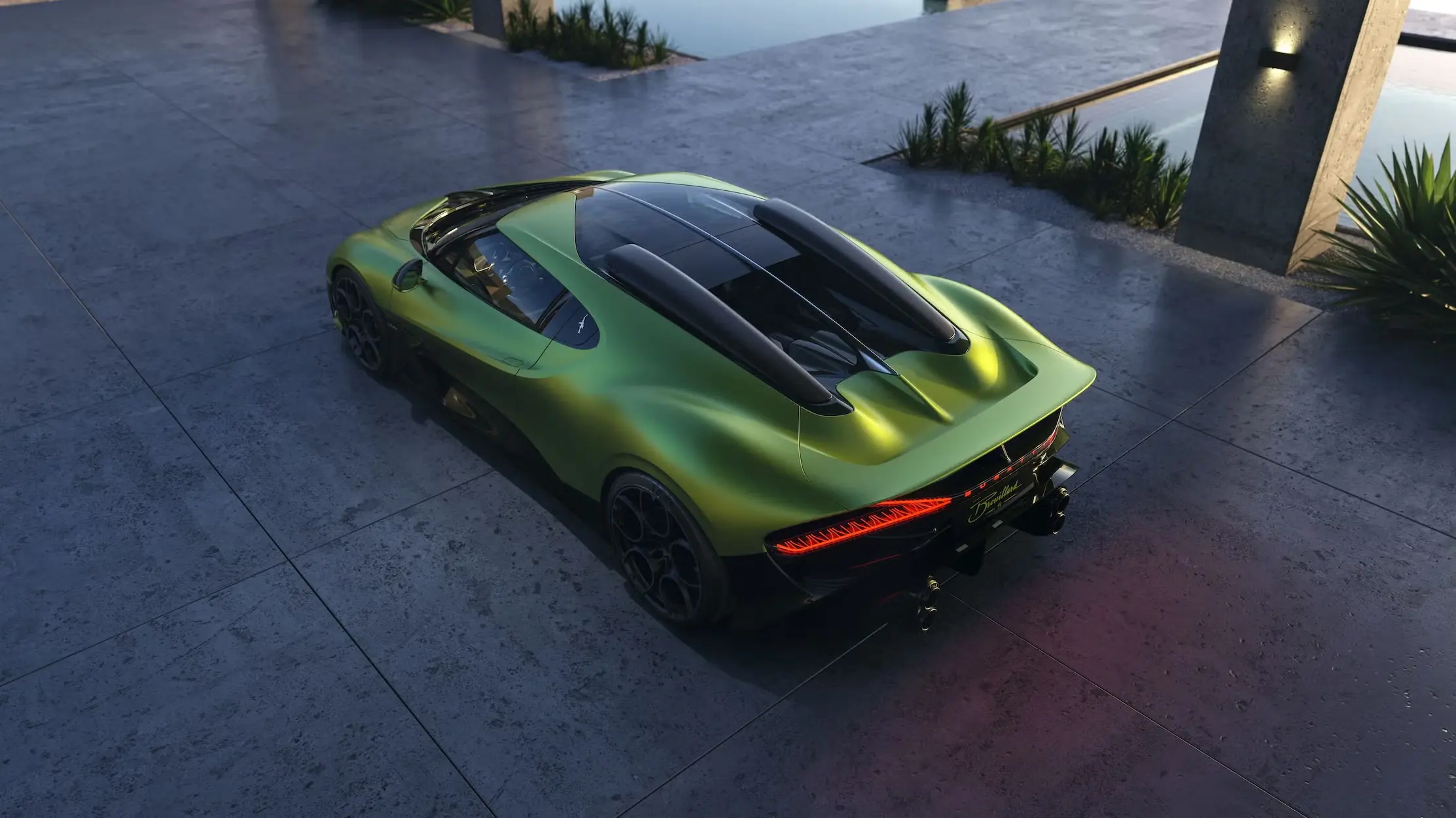 Bugatti shaped the Brouillard’s exterior to balance elegance and high speed stability. The car integrates front intakes that improve cooling efficiency, a fixed ducktail rear wing for added downforce, and a functional diffuser re engineered around a repositioned exhaust system. Proportions highlight a sleek, elongated profile with a dark toned lower body to visually lower the stance. Details such as LED front lights, arrow shaped taillights, illuminated Bugatti lettering, and a continuous center spine evoke both futuristic artistry and equestrian muscle, ensuring the Brouillard turns heads on UAE roads.