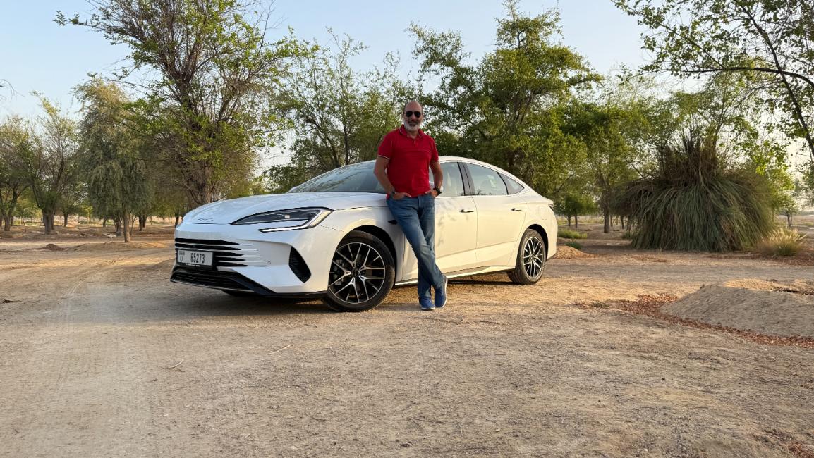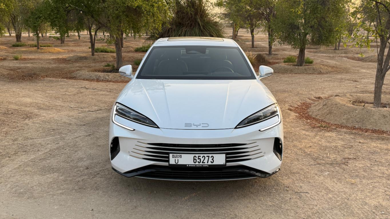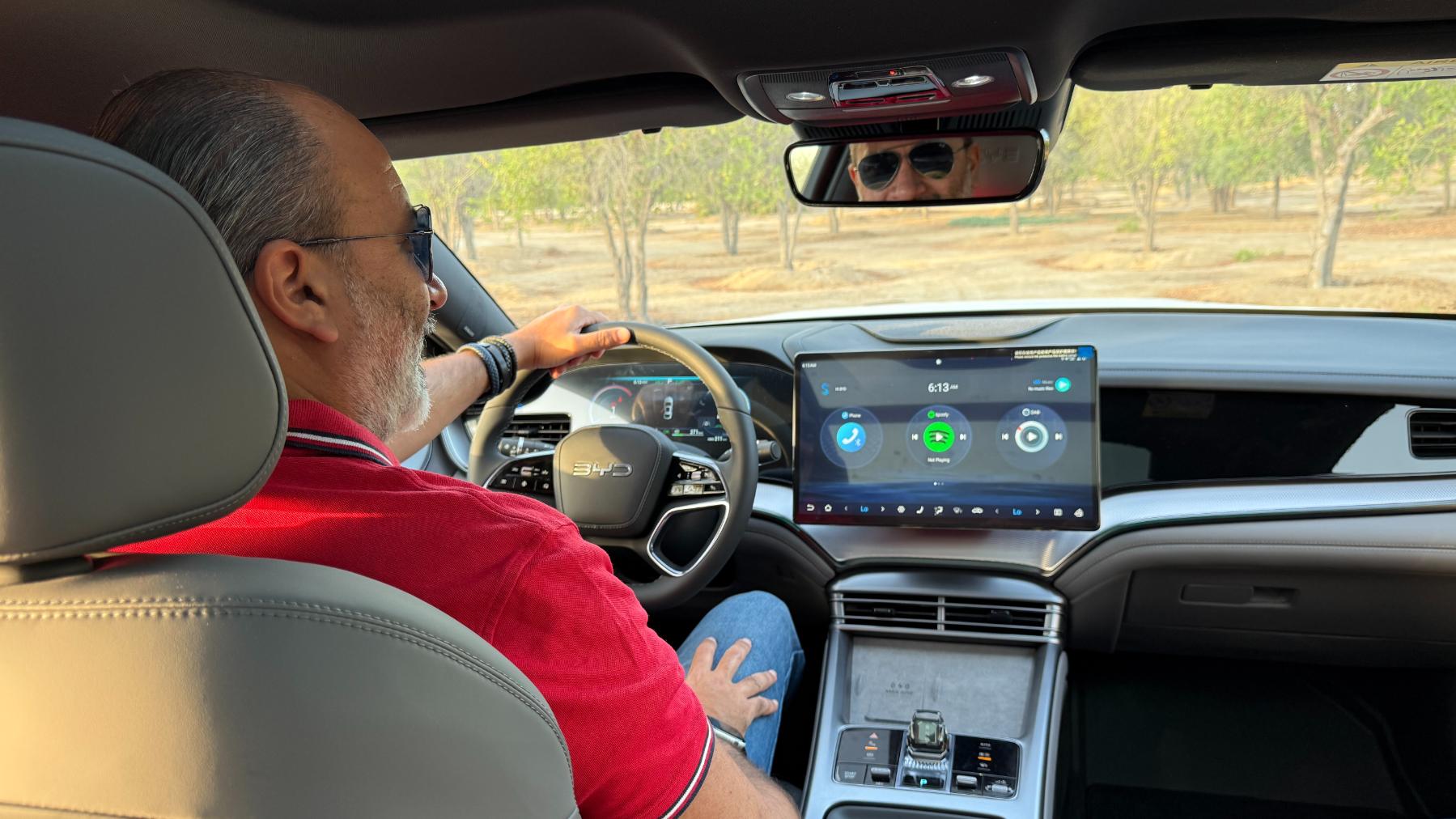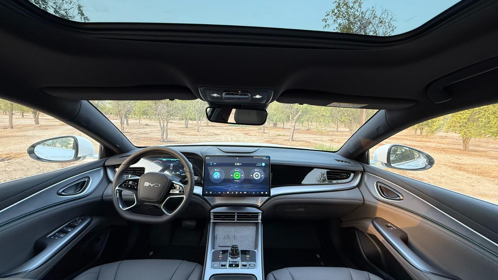Above, the panoramic sunroof floods the interior with natural light. The rotating 15.6-inch multimedia touchscreen offers access to BYD’s DiLink OS, compatible with Apple CarPlay and Android Auto, while the 12-speaker Dynaudio sound system delivers crisp, immersive audio that elevates every journey.