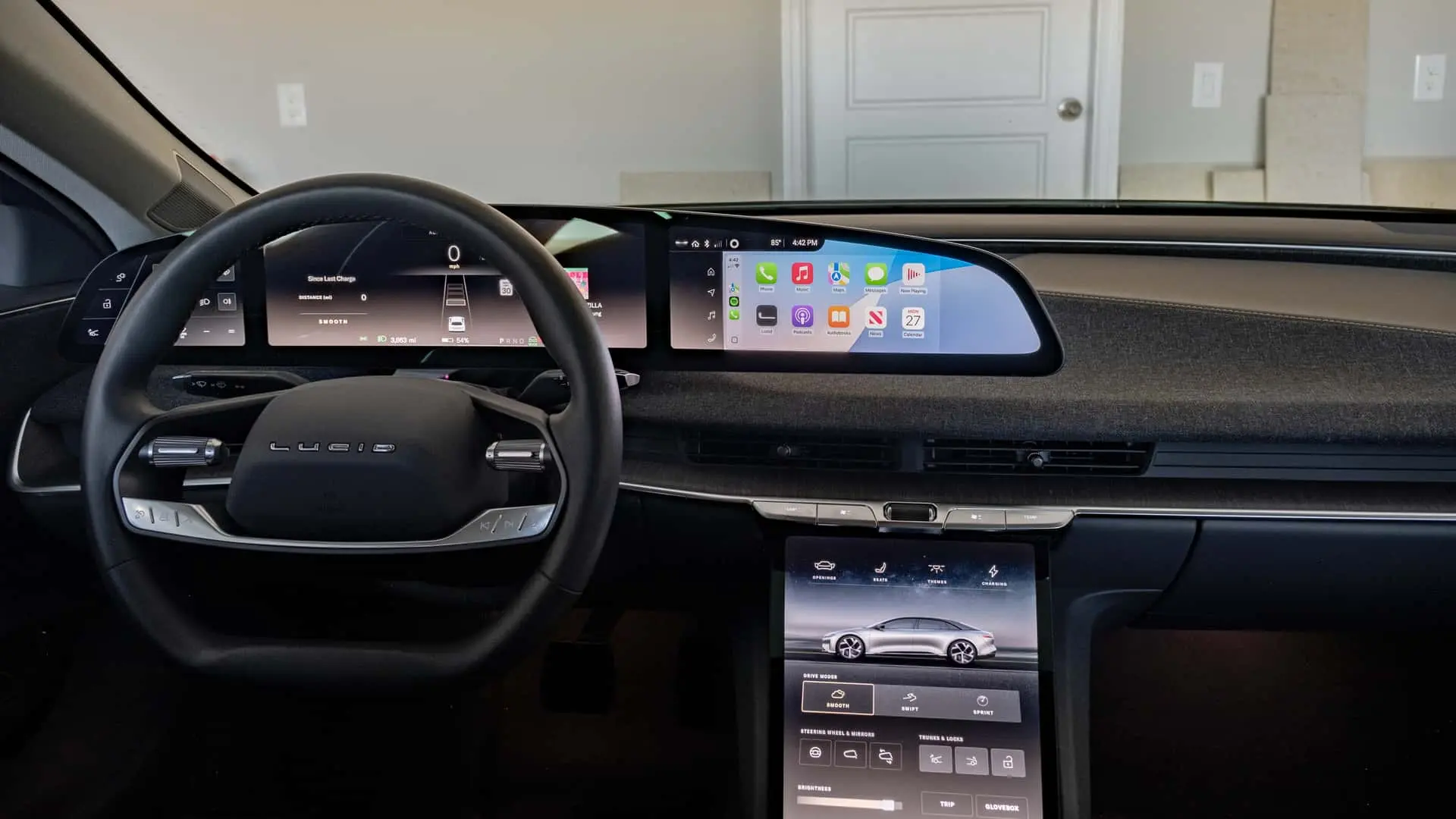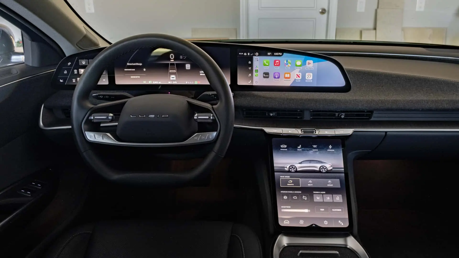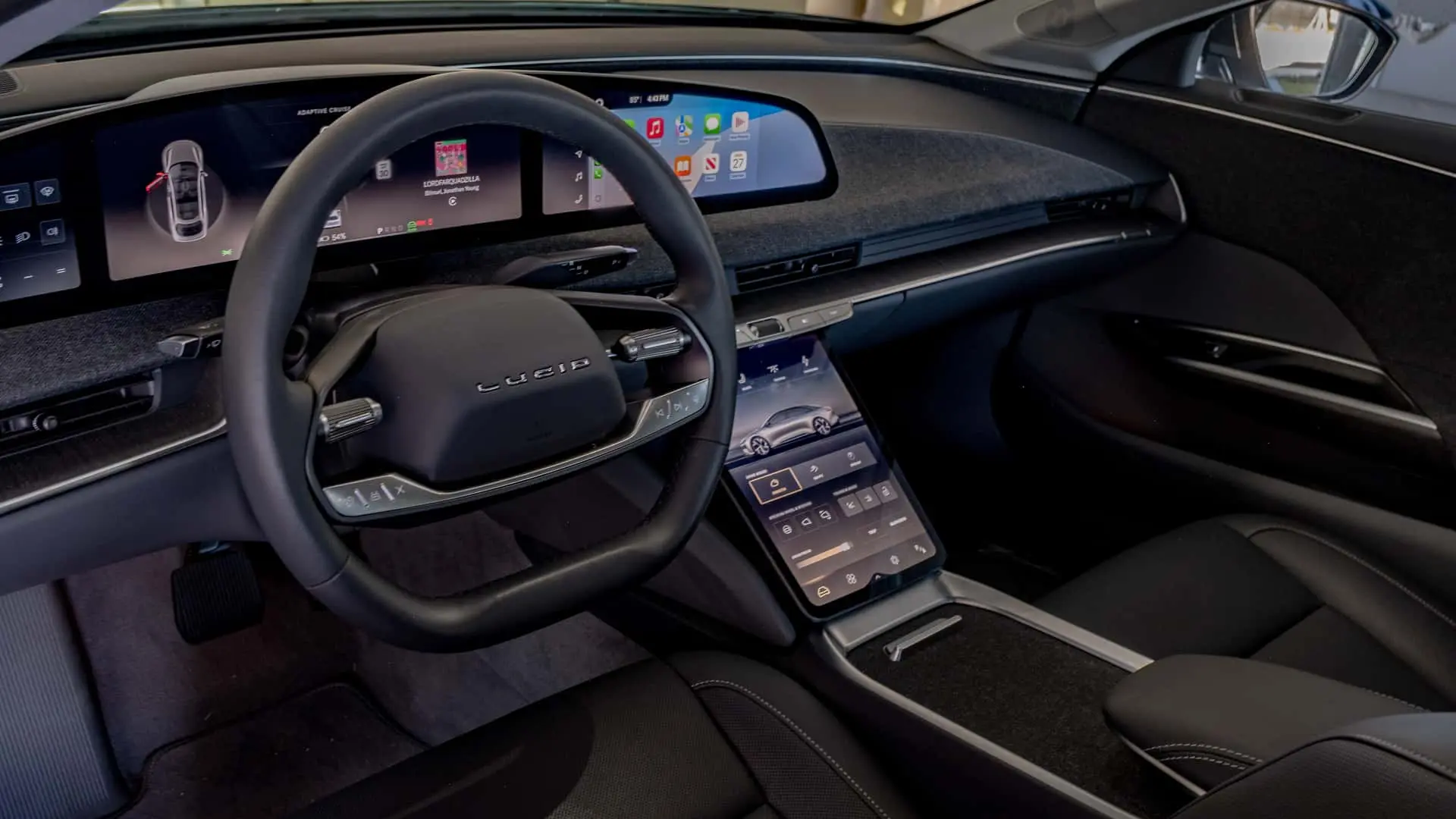 Lucid’s infotainment setup is both practical and visually appealing. The center touchscreen is smaller than those found in some competitors but remains highly functional. The home screen layout is clean, placing crucial information—such as navigation, weather updates, and audio settings—front and center. Wireless Apple CarPlay comes standard, though the curved display reduces its effective area, leading to an awkward fit. Android Auto, while currently unavailable, is expected to arrive in a future update.