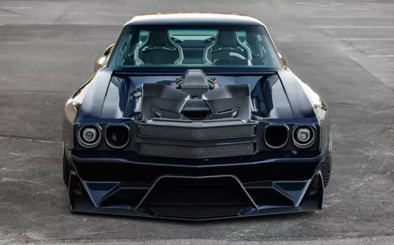 Doughboy’s widebody is hand-sculpted and 3D-scanned for precise fitment and finished with Porsche’s factory Night Blue Metallic paint. Inspired by modern GT Cup cars, the body maintains the classic muscle car aesthetic of the 1970 Chevelle while incorporating contemporary elements like cleanly integrated side-exit exhausts, a carbon-fiber flat bottom and a custom 3D-printed front bumper with integrated air ducts. The rear of the vehicle features a carbon-fiber trunk lid with integrated cameras acting as turn signal indicators, further emphasizing Doughboy’s blend of vintage design with modern technology. Custom infinity taillights and shaved drip rails round out the exterior’s modern aesthetic.