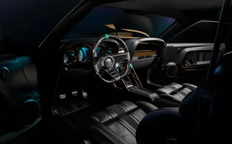 Every body panel was subtly reshaped. The front was widened by two inches and the rear by 3.5 inches, creating a planted, powerful stance. The wheelbase grew by 1.5 inches for added presence. Carbon fiber is everywhere, on the roof, sills, and rear wing, trimming weight while adding an exclusive, athletic touch. The custom lighting and bumpers keep the car’s classic Mustang DNA front and center.