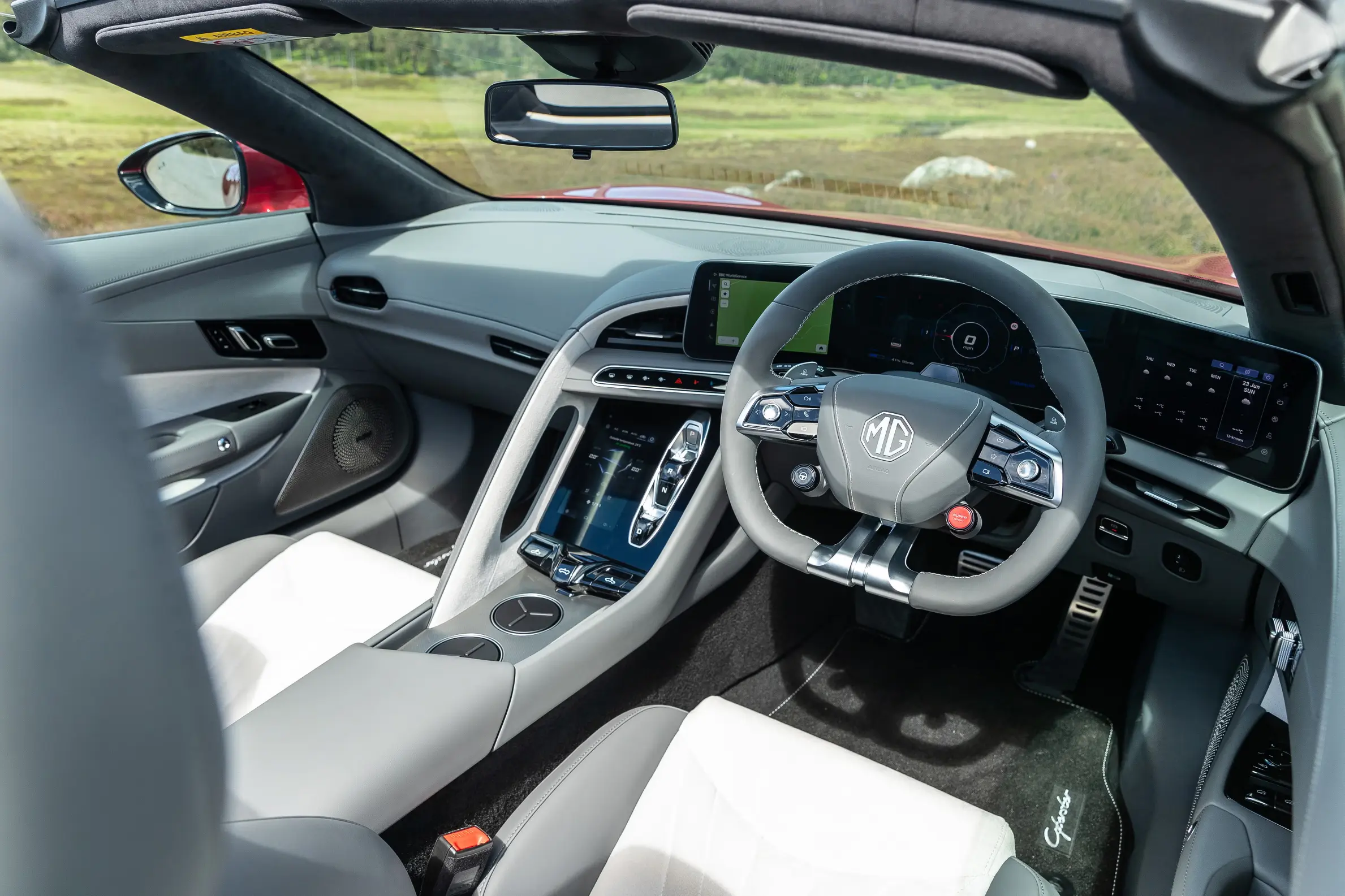 Inside, the MG Cyberster feels more like a high end gaming cockpit than a traditional sports car. A triple screen display wraps around the driver, and premium materials like Alcantara and leather are everywhere. The seating position is classic sports car — low, supportive, and perfect for long drives.
